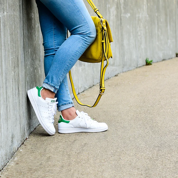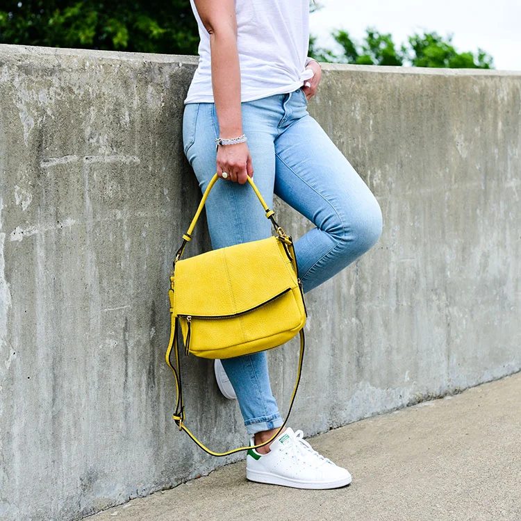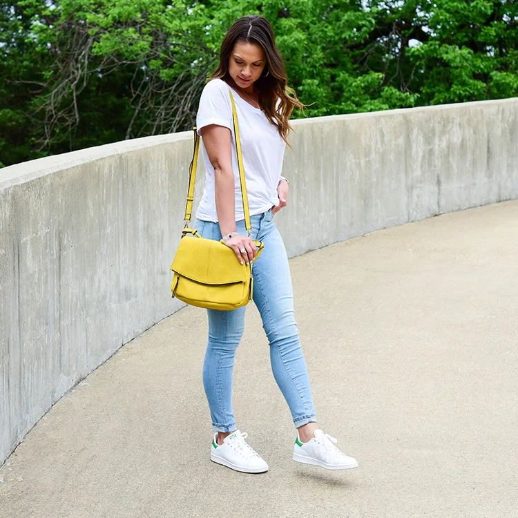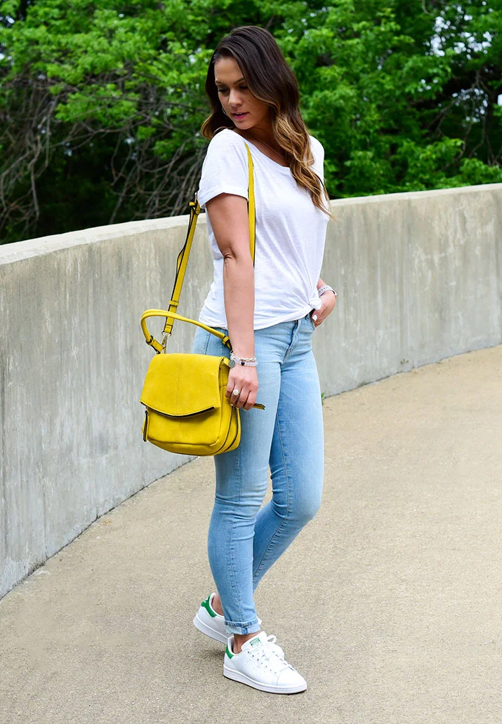 I can’t help sometimes than to stick with the not-so-basics essentials. I have probably 5 of the similar style color of tees and jeans because you can never have enough of the same color but slightly different style in your closet. I fell in love with jeans from H&M because of the fit and it was perfect for my shape. I have runner legs, so sometimes it can be hard finding jeans that fit perfect with my thick thighs and calve muscles. I am a humble, but with a hint of Kanye type of girl. Sometimes I can go with the basics, but need that extra something that will add to my outfits. I tied the white tee on the side and added a pop of color with this yellow purse. Finished off of course with my Stan Smith Adidas that I adore for that comfort street style. Have a great weekend! – xo Mel